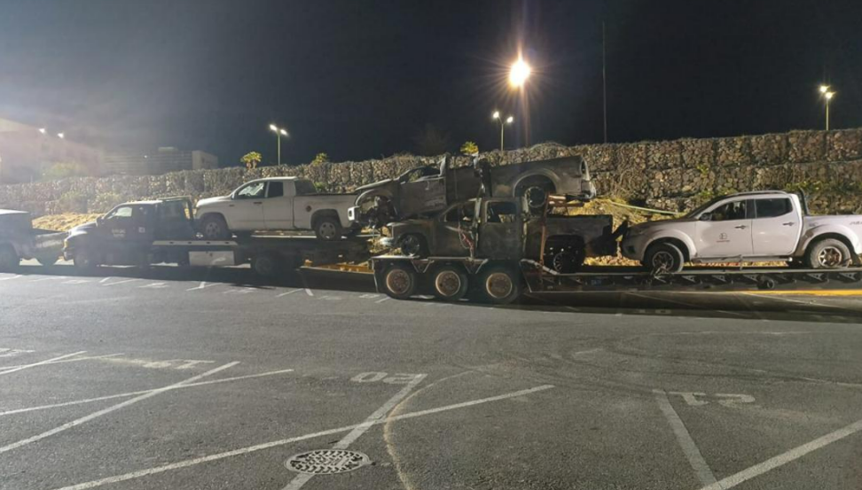 Tras la inspección correspondiente, realizada en coordinación con el Ejército Mexicano, se localizaron un vehículo Nissan Frontier, así como una Toyota Tundra y un Jeep Mojave, estos últimos con reporte de robo en los Estados Unidos, asimismo, se localizaron dos pick up calcinadas, siendo una Ford Super Duty y una Chevrolet.